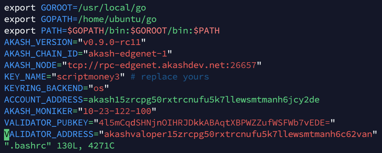 输入 akash --keyring-backend "$KEYRING_BACKEND" keys show "$KEY_NAME" -a 打印钱包地址,以ACCOUNT_ADDRESS为变量名填入.bashrc,可参考上面的图片。